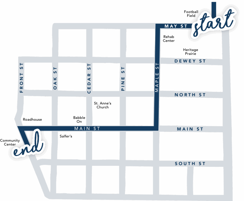 Lineup will start at 7:00 pm at the parking lot near the Wabasso football field/bus garage. The route will head west along May Street for one block before turning left in front of the Wabasso Rehabilitation Center and then right onto Main Street—ending at the Community Center. Click here to view the parade route.